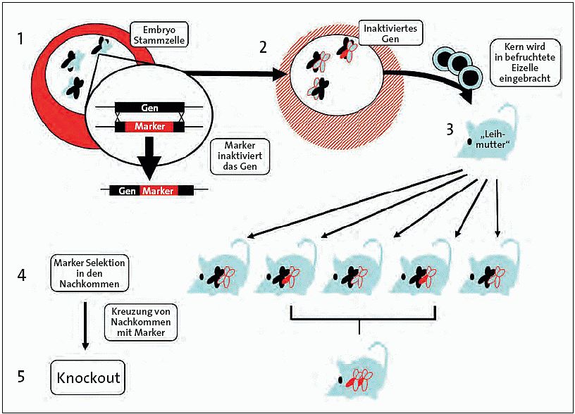Figure 1. Abb. 1 Schematische Darstellung der Herstellung eines Knockouts. Um ein bestimmtes Gen in einer Maus auszuschalten, wird ein genetischer Marker so konzipiert, dass er in das betreffende Gen in einer embryonalen Stammzelle integriert werden kann (1). Danach wird der Zellkern dieser Stammzelle in Eizellen eingebracht (2), die dann in eine pseudoträchtige Maus übertragen werden (3). Mehrere der Neugeborenen werden Träger des unterbrochenen Gens sein (4). Durch Kreuzung dieser Träger, die mit Hilfe des Markers ausgewählt werden können, wird sichergestellt, dass die zweite Generation Knockouts hervorbringt, bei denen beide Gene unterbrochen sind (5).