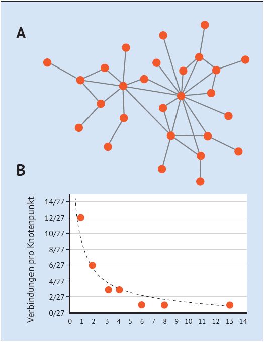 Figure 3. Abb. 3 Beispiel für ein kleines skalenfreies Netzwerk (A). Von den 27 Knoten stellen nur wenige die meisten Verbindungen her. Wenn man die relative Anzahl der Verbindungen pro Knoten gegen die Anzahl der Knoten mit einer bestimmten Anzahl von Verbindungen aufträgt, erhält man eine Potenzgesetzbeziehung (B). (Nach Barabási & Oltvai 2004)