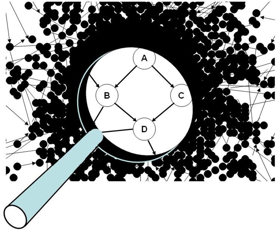 Figure 4. Abb. 4 Die Lupe zoomt auf 4 Knoten (A, B, C, D) eines komplexen biologischen Netzwerks. In diesem Netzwerk kann A über zwei verschiedene Wege D erreichen, über B oder über C. Wenn B inaktiviert ist, kann D immer noch über C erreicht werden. Um die Robustheit lebender Organismen zu gewährleisten, sind biologische Systeme mit Redundanzen wie dieser konstruiert, was ein klares Zeichen für die Prinzipien der Ingenieurskunst ist.
