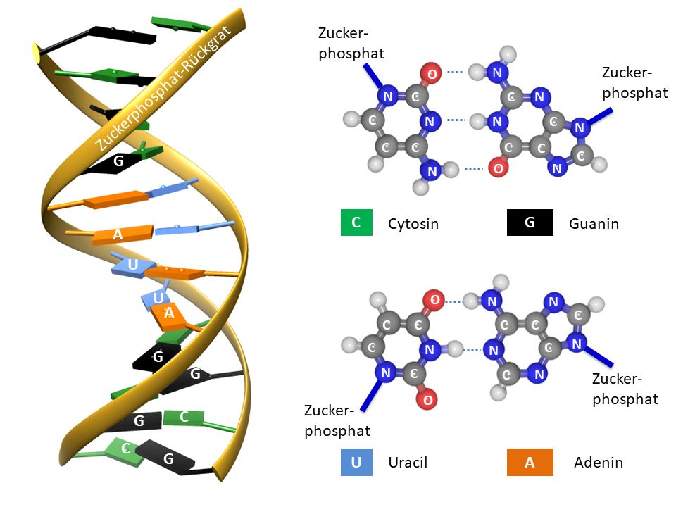 Die Grundlage des Lebens auf der molekularen Ebene sind drei Typen von Kettenmolekülen (Polymere): Desoxyribonukleinsäuren (DNA), Ribonukleinsäuren (RNA) und Proteine. Diese Makromoleküle bestehen aus strukturell einheitlich aufgebauten Kettengliedern (Monomere) und ergänzen sich hinsichtlich ihrer biochemischen Funktionen, weswegen sie auch als „zelluläre Trinität“ bezeichnet werden. Während in der DNA genetische Information gespeichert ist, sind die meisten Proteine Katalysatoren, d. h. sie beschleunigen biochemische Reaktionen und ermöglichen so den Betrieb der Zelle. RNA-Moleküle (vgl. Abb. 2) stellen eine Art Schnittstelle zwischen der Welt des Erbguts (DNA) und der Welt der Proteine dar. Sie können sowohl als Informationsspeicher als auch als Katalysatoren fungieren – wenn auch zweiteres nur in sehr beschränktem Ausmaß.