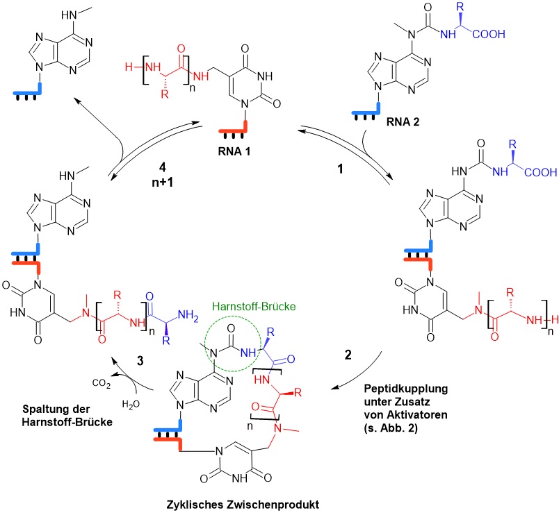 Figure 2. Abb. 3 Schematische Darstellung der zyklischen Peptidsynthese an RNA-Molekülen nach Müller et al. (2022). Schritt 1: Annealing* von RNA 1 und RNA 2, außerdem werden die zu kuppelnden Aminosäuren in räumliche Nähe gebracht; Schritt 2: Peptidkupplung unter Einsatz von Aktivatoren; Schritt 3: Spaltung der Harnstoff-Brücke; Schritt 4: Dissoziation von RNA 1 und RNA 2, die Peptideinheit ist nun um eine Aminosäure verlängert (n+1).