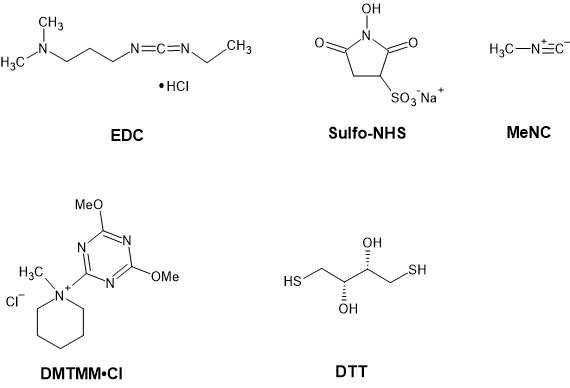 Bei den Kupplungsreaktionen zur Synthese von Peptiden war aufgrund der ausgeprägten Reaktionsträgheit der Carboxylgruppe chemische Aktivierung erforderlich. Dazu wurden verschiedene, kommerziell erhältliche Aktivatoren eingesetzt (EDC, Sulfo-NHS, DMTMMCl, MeNC, DTT, s. Abb. 4). Solche Verbindungen sind als „chemische Werkzeuge“ für die Peptidsynthese entwickelt worden. Von diesen Molekülen kann einzig das Cyanamid als der strukturell einfachste Aktivator als potenziell „präbiotisch“ eingestuft werden.