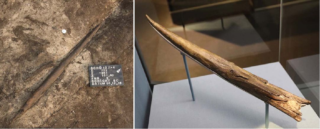 Figure 2. Abb. 3 Links: Fundsituation des neu entdeckten Wurfstocks von Schöningen. Rechts der „Clacton Spear“. (Wikimedia, CC BY-SA 4.0: A. Gonschior, Niedersächsisches Landesamt für Denkmalpflege; Geni)