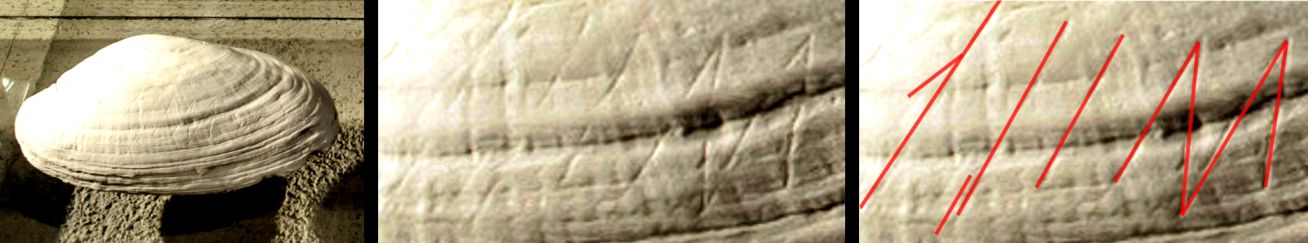 Figure 3. Abb. 4 Homo erectus hinterließ auf Trinil eine Muschel vor ca. 0,5 MrJ mit einem eingravierten Muster, das absichtlich erzeugt wurde. (Wikimedia: Henk Caspers/Naturalis Biodiversity Center, CC BY-SA 3.0; rote Linien: eigene Darstellung)