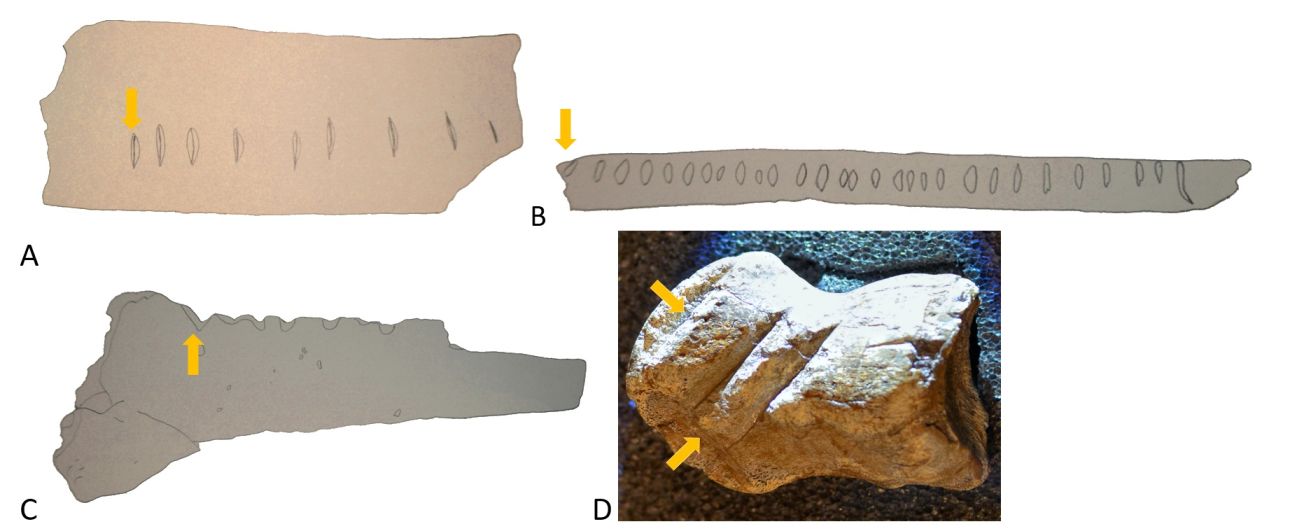 Figure 4. Abb. 5 Skizze des Hyänenknochens aus Les Pradelles: Die neun Kerben dienten einem Neandertaler wahrscheinlich zur Übermittlung numerischer Information (A) – ebenso wie bei einem Pavianknochen aus der Border Cave von Homo sapiens (B). Der Rabenknochen von der Krim stellt wohl ein Muster eines Neandertalers dar (C) – wie auch ein Riesenhirschknochen aus der Einhornhöhle (D). (Eigene Skizzen nach D’Errico et al. 2018; Majkic et al. 2017; Wikimedia: Axel Hindemith, CC BY-cA 3.0)