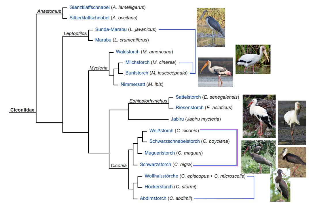 Unter den vorgestellten unterschiedlichen Cladogrammen der Störche gleicht kein einziges auf Gattungsebene dem anderen.
