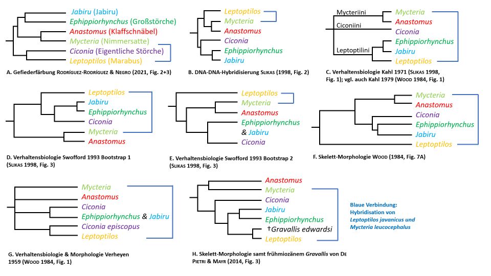 Figure 2. Abb. 3 Verschiedene Cladogramme basieren auf verschiedenen Merkmalen. Diese wurden der Übersichtlichkeit halber hier auf der Ebene der heutigen Gattungen dargestellt (in den Originalen wurde immer auf Artebene gearbeitet; Gattungsnamen waren z. T. anders als heute). Die gelungene Hybridisierung zwischen Lepto­ptilosjavanicus und Mycterialeucocephala (s. o.) in blau legt in allen Cladogrammen außer B. und E. eine Zugehörigkeit aller Störche zu demselben Grundtyp nahe. A. Gefieder-Farbmuster der Störche nach Rodríguez-Rodríguez & Negro (2021, Fig. 2+3); B. DNA-DNA-Hybridisierung (Slikas 1998, Fig. 2); C. Verhaltensbiologie nach Kahl 1971 (Slikas 1998, Fig. 1; vgl. auch Wood 1984, Fig. 1: Kahl 1979 – Kahl 1972 ist aber leicht anders); D. und E. zwei Bootstrap-Analysen nach Swofford 1993 (Slikas 1998, Fig. 3); F. Skelettmorphologie insgesamt nach Wood (1984, Fig. 1); G. Verhaltensbiologie & Morphologie nach Verheyen 1959 (Wood 1984, Fig. 1); H. Skelett-Morphologie samt untermiozänem Gravallisedwardsi(23–16 Mio. radiometrische Jahre) nach De Pietri & Mayr (2014, Fig. 3). (Eigene Darstellung)