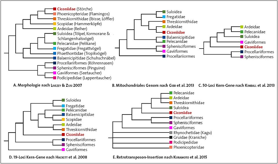 Figure 3. Abb. 4 Verschiedene Cladogramme zu den Verwandtschaftsbeziehungen der Wasservögel nach Kuramoto et al. (2015, Fig. 1+3): A Morphologie nach Livezey & Zusi 2007; B mitochondriales Genom nach Gibb et al. 2013; C 50-Loci Kern-Gene nach Kimball et al. 2013; D 19-Loci Kern-Gene nach Hackett et al. 2008; E Retrotransposon-Insertion nach Kuramoto et al. 2015. Die Position der Störche (Cociniidae; fett dunkelrot) sowie die Positionen fast aller anderen Wasservögel sind total widersprüchlich. (Eigene Darstellung)