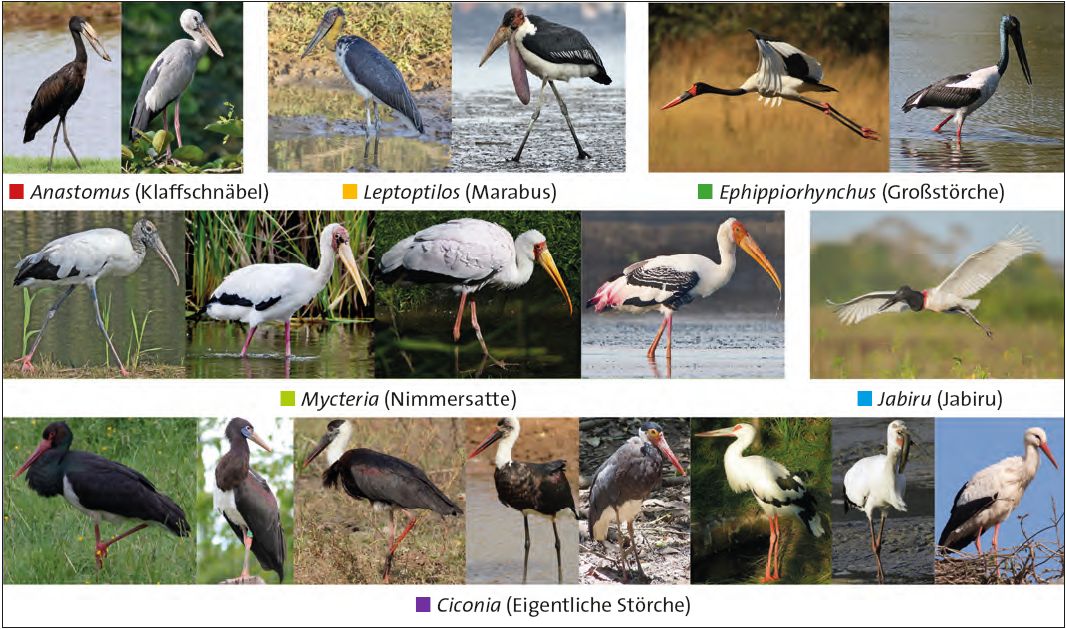 Figure 4. Abb. 5 Die Familie der Störche bildet wahrscheinlich einen Grundtyp, wobei aus molekulargenetischer Hinsicht noch Forschungsbedarf besteht. (©Winfried Borlinghaus; Wikimedia: CC BY 2.0: DChai21 / Derek / Derek Keats / Mike Prince; CC BY-SA 2.0: Lip Kee Yap, flickr; CC BY-SA 2.5 ar: © 2006 Carla; Antonini; CC BY 3.0: JJ Harrison (https://www.jjharrison.com.au/) / spaceaero2 / Sea1109; CC BY-SA 3.0: Gediminas - Picasa Web Albums / DickDaniels (http://theworldbirds.org/) / © Hans Hillewaert; CC BY-SA 4.0: Charles J. Sharp / Dr. Raju Kasambe / Andreas Trepte)