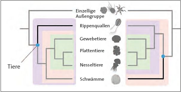 Figure 3. Abb. 3 Zwei alternative Stammbaumhypothesen für die vielzelligen Tiere (Metazoa), wobei entweder Rippenquallen (links) oder Schwämme (rechts) als Schwestergruppe zu allen anderen Tieren gelten. (Aus Schultz et al. 2023, CC BY 4.0, http://creativecommons.org/licenses/by/4.0/, in deutscher Übersetzung)