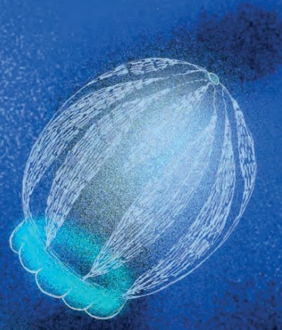 Figure 1. Abb. 1 Rippenqualle Bathocyroefosteri. Am oberen, mundabgewandten Ende sind Kammplättchen in der Seitenansicht erkennbar. (CC0)
