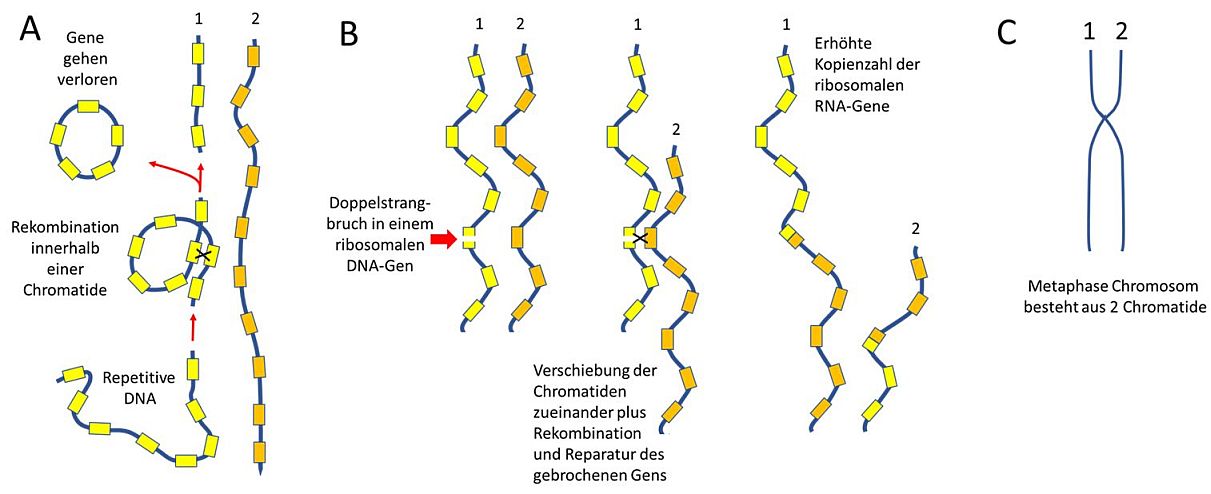 Figure 4. Abb. 4 A Modell der Instabilität von repetitiver DNA. Durch Überkreuzungen verschwinden Teile des Chromatids und die Anzahl der Gene verringert sich mit der Zeit. B Schema der Erweiterung der ribosomalen DNA-Kopienzahl durch ungleichen Austausch von Schwesterchromatiden bei Doppelstrangbrüchen in ribosomalen RNA-Genen. Durch Rekombination zwischen verschobenen Kopien entsteht ein ungleicher Austausch von Schwesterchromatiden, der die Anzahl der Kopien auf einem Chromatid erhöht. Dies wird durch das Retrotransposon R2 in Drosophila vermittelt. C In der Metaphase (also während der Zellteilung) bestehen die Chromosomen aus 2 Chromatiden, die hier mit den Zahlen 1 und 2 gekennzeichnet sind. Auch in A und B bezeichnen die Zahlen 1 und 2 die beiden Chromatiden. (A und B nach Nelson et al. 2023)