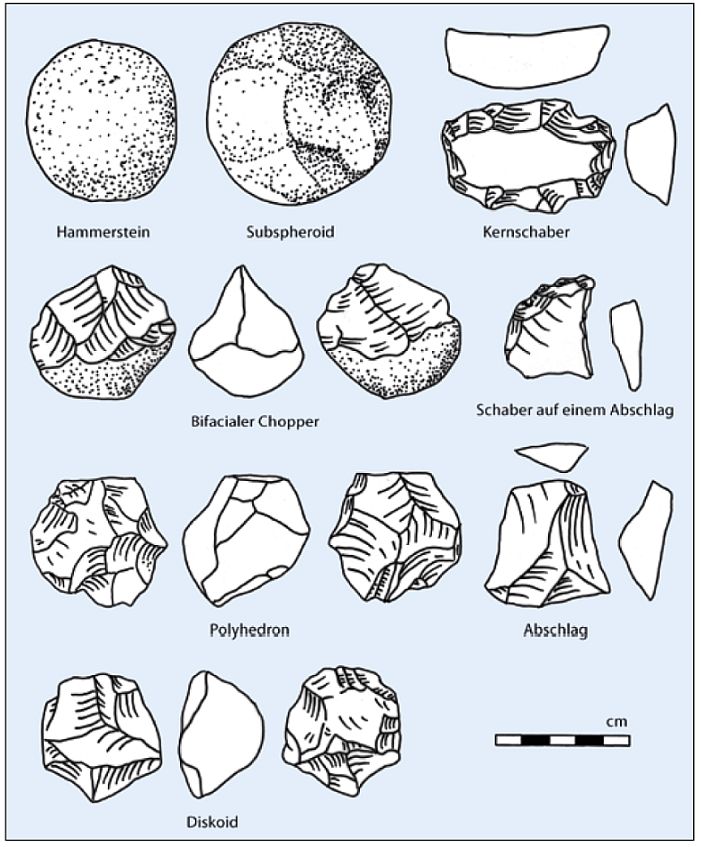 Figure 1. Abb. 2 Typische Artefakte der frühen Altsteinzeit (Oldowan). (Nach Klein 2000, Fig. 2; aus Brandt 2023)