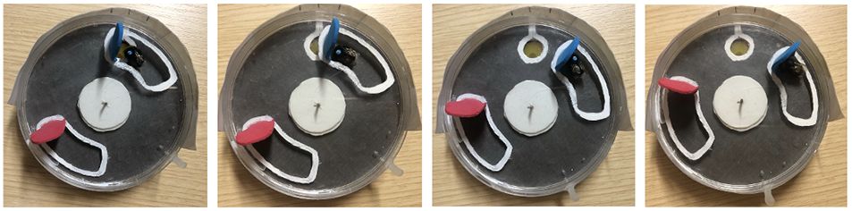 Zuerst trainierten die Wissenschaftler Hummeln darauf, sich den Zusammenhang zwischen einem gelben Punkt und der darauf befindlichen Saccharose-Zuckerlösung zu merken (Klassische Konditionierung). Danach verdeckten sie die Zuckerlösung mit einer Drehscheibe. Diese musste mithilfe eines blauen bzw. roten Hebels durch Schieben gedreht werden, um so zum gelben Punkt mit Zuckerlösung zu gelangen. Schrittweise wurde die Distanz zwischen Hebel und Futter erhöht (siehe Abb. 2). Dabei wurde eine Gruppe von Hummeln auf den blauen und eine Gruppe auf den roten Hebel trainiert. Mit der Zeit lernten einige Hummeln zuverlässig (bis zu 100-mal am Tag), den Hebel zu schieben und so zur Zuckerlösung zu gelangen (S. 13).