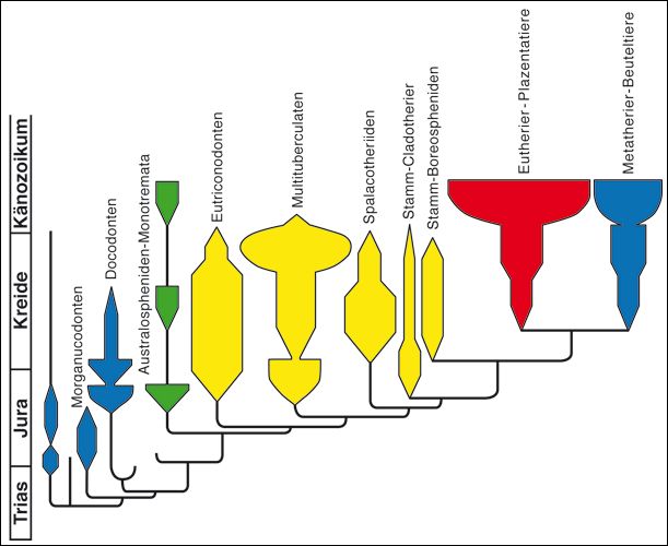 Figure 2. Abb. 2 Systematik der Säugetiere im weiteren Sinne (Mammaliaformes). Dunkelblau: Schwestergruppen der Säugetiere im engeren Sinne (Mammalia). Gelb: ausgestorbene Gruppen von Kronen-Säugetieren. Grün: Kloakentiere (Monotremata). Hellblau: Beutelsäuger (Metatheria/Marsupialia). Rot: höhere Säugetiere oder Plazentatiere (Eutheria/Plazentalia). (Nach Luo 2007)