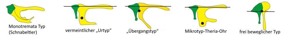 Ein besonderes Kennzeichen (Schlüsselmerkmal) der Säugetiere stellt das Mittelohr mit den charakteristischen drei Mittelohrknochen (MOK; vgl.  Abb. 1) dar: Hammer (Malleus), Amboss (Incus) und Steigbügel (Stapes). Deren Evolution galt bis zum Ende des 20. Jahrhunderts als Paradebeispiel für eine lineare evolutionäre Umwandlung (z. B. in Form der Reichert-Gauppschen-Theorie, vgl. Ullrich 1994). Bis vor 25 Jahren ging man davon aus, dass die Evolution der Säugetiere einmalig (monophyletisch), stufenweise und kontinuierlich (graduell) ohne Sprünge oder rasante Diversifikationen erfolgte. Das bedeutet: Auch die Evolution der Umwandlung von Kieferknochen der Reptilien (z. B. Quadratum, Artikulare, Angulare) in die MOK der Säugetiere verlief graduell und monophyletisch (vgl. Abb. 5).