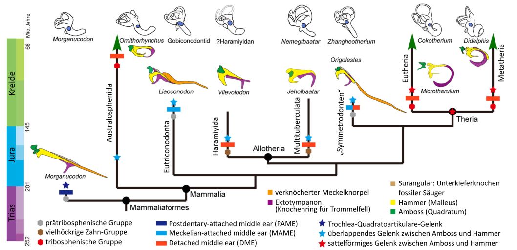 Abb. 5 dokumentiert die große Variabilität der Mittelohrformen bei den Säugetieren im weiteren Sinne (Mammaliaformes). Darüber hinaus wird erneut belegt, dass aus evolutionärer Perspektive vielfache, unabhängige und gleichgerichtete Entwicklungssprünge bei der Entstehung des Mittelohres angenommen werden müssen. Das freistehende Mittelohr (detached middle ear, DME) und die damit verbundene Entkopplung von Hör- und Kauapparat entwickelte sich nach der aktuellen Phylogenie mehrfach in mesozoischen Säugetierformen (Abb. 5). Als zugrundeliegender Mechanismus für das Entkopplungsereignis (wobei man hier richtiger von einem hypothetischen Selektionsvorteil sprechen sollte), wird von den Autoren lediglich die Anpassung an ein effizientes Kauen ins Spiel gebracht.