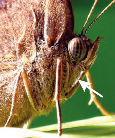 Figure 2. Abb. 2 Reduzierte Vorderbeine vonBicyclusanynana (Nymphalidae), siehe weißer Pfeil. (Aus Wolfe et al. 2011, CC BY 3.0, http://creativecommons.org/licenses/by/3.0/)