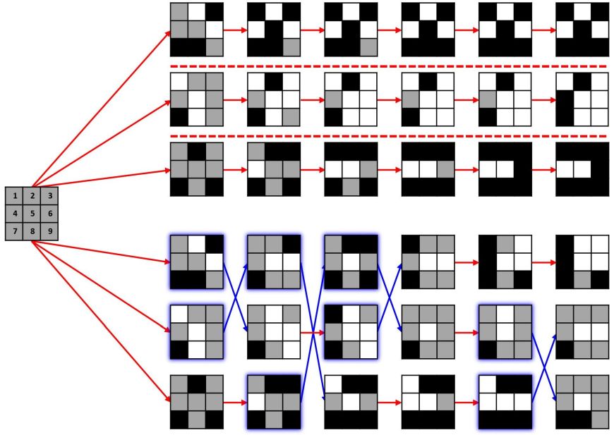 Figure 4. Abb. 4 Die Auswirkungen der meiotischen Rekombination auf einen panheterozygoten Organismus mit 9 Genen im Verlauf von sechs aufeinanderfolgenden Generationen (F1–F6). Heterozygote Gene (het.) sind grau dargestellt, homozygote dominante Gene (hom-d.) schwarz, homozygote rezessive Gene (hom-r.) weiß. Bei reproduktiver Isolation (rot gestrichelte Linien) sind nur Selbstkreuzungen möglich, sodass nach jeder Generation (Meiose) aus heterozygoten Genen 25 % hom-d., 50 % het., 25 % hom-r. werden. Obere Hälfte: Drei Linien mit reproduktiver Isolation (rot gestrichelte Linien). Nach sechs Generationen sind alle drei Linien vollständig homozygot und haben sich zu drei separaten, fixierten Arten entwickelt. Das Gen 7 wurde in allen drei Linien in der ersten Generation (F1) fixiert. Untere Hälfte: Dieselben drei Linien bei F1 wie die oberen drei, aber mit der Möglichkeit, gelegentlich zu hybridisieren (die Hybridisierungsraten wurden in diesem Beispiel mit einer Wahrscheinlichkeit von 25 % zwischen zwei beliebigen Linien bei jeder Generation gewählt). Wenn eine Hybridisierung (= blaue Pfeile) stattfindet, kann folgendes eintreten: hom. Gen  gleiches hom. Gen führt zu keiner Veränderung der Nachkommenschaft; hom. Gen  anderes hom. Gen führt zu het. Nachkommenschaft; hom. Gen  het. Gen führt zu 50 % hom. Gen, 50 % het. Gen; het. Gen  het. Gen führt zu 25 % hom-d., 50 % hetero., 25 % hom-r. Nach sechs Generationen sind 13 von insgesamt 27 Genen (insgesamt 9 Gene in allen 3 Linien) noch heterozygot. Die Gene 5 und 7 wurden in allen Linien in der F3 bzw. F1 fixiert. (Dieser „9-Gene“-Organismus sollte besser als „9-Merkmale“-Organismus bezeichnet werden, weil in der Regel mehr als ein Gen an der Ausprägung der Merkmalsausprägungen eines Merkmals beteiligt ist (= Polygenie)).
