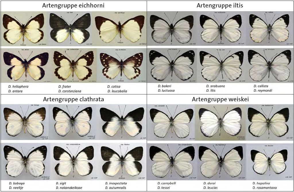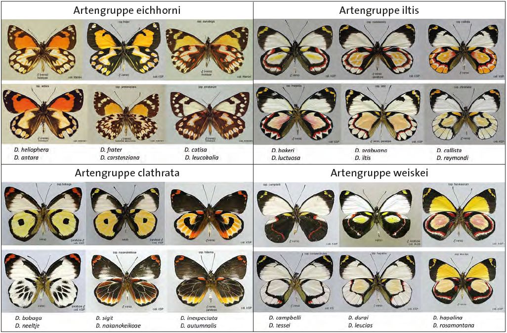 Die 118 papuanischen Delias-Arten werden in 17 Artengruppen eingeteilt, die oft mit geografischen Standorten verbunden sind. Die Gattung Delias ist ein geeignetes Untersuchungsfeld für Fragen der Artbildung, weil sie so viele Artengruppen umfasst. Von großer praktischer Bedeutung ist, dass Delias-Schmetterlinge zwar die üblichen schwarz-weißen Flügelmuster der Pieriden aufweisen, aber auch auffällige, leuchtend bunte, charakteristische Flügelmuster auf der Unterseite der Flügel (Abb. 6), die die Grundlage für eine robuste, eindeutige und genaue Auswertung bilden.