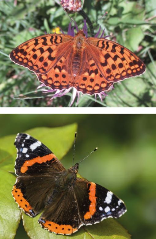Figure 1. Abb. 1 Oben: Perlmuttfalter (Argynnisadippe) im hinteren Großen Walsertal. (Foto: R. Junker) Unten: Admiral (Vanessa atalanta). Der Name des Falters rührt daher, dass seine Farben – schwarz mit weiß und rot – den Farben früherer Admiralsuniformen entsprechen. (Foto: Adobe Stock)