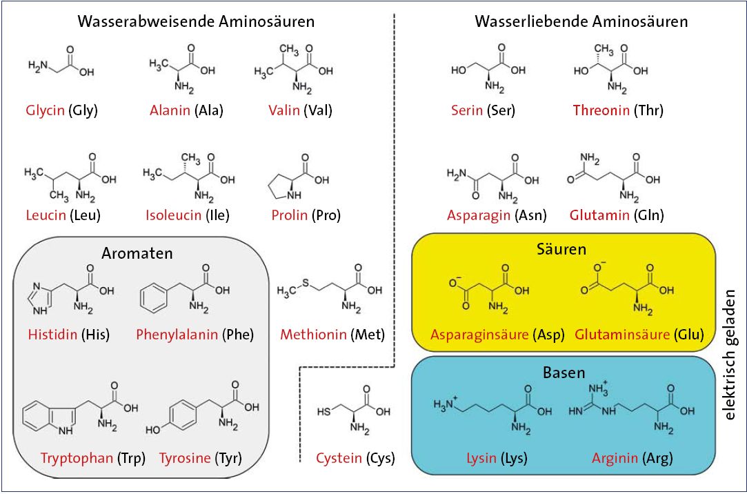 Proteine sind für den Aufbau und die Funktionsweise der Zelle unverzichtbare kettenförmige Makromoleküle. Strukturproteine sind ein wesentlicher Bestandteil des „Zellgerüsts“ und eine Vielzahl katalytisch* aktiver Proteine reguliert den Stoffwechsel und Energiehaushalt der Zelle. Die Proteine aller Lebewesen bestehen aus einem Satz von zwanzig kanonischen Aminosäuren (Abb. 1) – abgesehen von einigen abgeleiteten oder in Spurenmengen vorkommenden nichtkanonischen Aminosäuren. Die chemischen und physikalischen Eigenschaften der Aminosäuren sind sehr vielfältig und werden durch die jeweilige Seitengruppe definiert. Es gibt wasserliebende, fettliebende und elektrisch geladene Aminosäure-Seitengruppen, die sich auch in der Größe zum Teil deutlich unterscheiden. Die Vielfalt der chemischen Eigenschaften dieser Bausteine ermöglicht den Zusammenbau sehr unterschiedlicher Proteine – hinsichtlich ihrer Größe, Flexibilität, 3D-Struktur, Wasserlöslichkeit und der chemischen Reaktivität. Man spricht in diesem Zusammenhang davon, dass das natürliche Aminosäurealphabet einen sehr großen chemischen Raum abdeckt, was für die große Vielfalt an Funktionen der Proteine in Organismen nötig ist (Illardo et al. 2019).