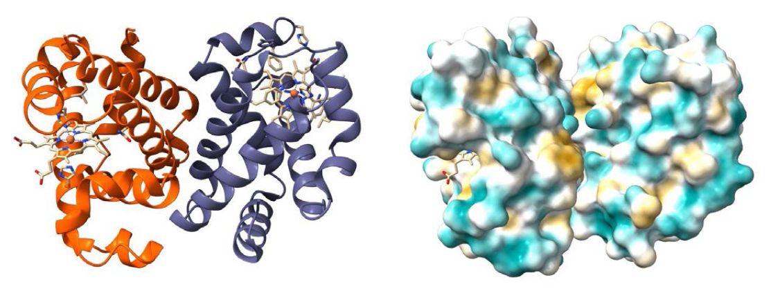 Figure 2. Abb. 2 Links: Modell der dreidimensionalen Struktur des humanen Hämoglobins (jeweils zwei gleiche Untereinheiten), das für den O2-Transport im Blut zuständig ist. Das Rückgrat der Proteineinheiten ist in Form einer vereinfachten Helix dargestellt. Rechts: Errechnete Hydrophilie (Software: ChimeraX) der Oberfläche der Hämoglobin-Proteinuntereinheiten (türkis: hydrophil; gelb: hydrophob). Daraus geht deutlich hervor, dass wasserliebende (hydrophile) Aminosäuren auf der Oberfläche stark überwiegen. Das ist für die Wasserlöslichkeit der Proteine unverzichtbar. (Abb. wurde anhand der Daten von Takahashi et al. (2024) erstellt, PDB-Code: 8wj2).