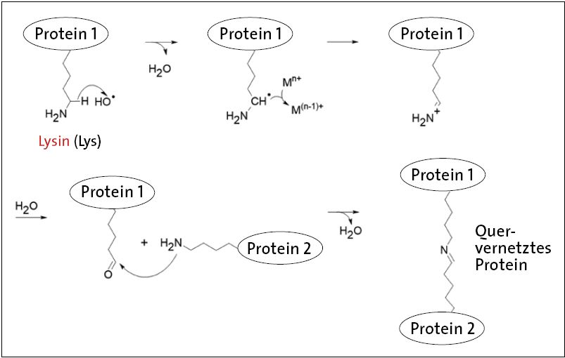 ROS: Die Entstehung reaktiver Sauerstoff-Verbindungen ist bereits früher ausführlich dargestellt worden (Schmidtgall 2022). Dabei ist nicht der Sauerstoff selbst für Zellen schädlich – sondern seine Reaktionsprodukte, die vor allem in Mitochondrien gebildet werden. Am reaktivsten ist das Hydroxylradikal (OH·), weniger reaktiv sind das Superoxidradikal (O2·) und Wasserstoffperoxid (HOOH). Weitere relevante ROS entstehen durch Reaktionen von Hydroxylradikalen mit Fettsäuren oder Alkoholen. Sie werden als Lipoxyl- oder Alkoxyl-Radikale (RO·) bezeichnet. Hydroxyl- und Alkoxyl-Radikale reagieren mit vielen verschiedenen Untereinheiten von Proteinen. Die am häufigsten auftretende Reaktion ist die Metall-katalysierte Desaminierung von Lysin unter Beteiligung von Hydroxylradikalen (Akagawa 2020) (Abb. 3).