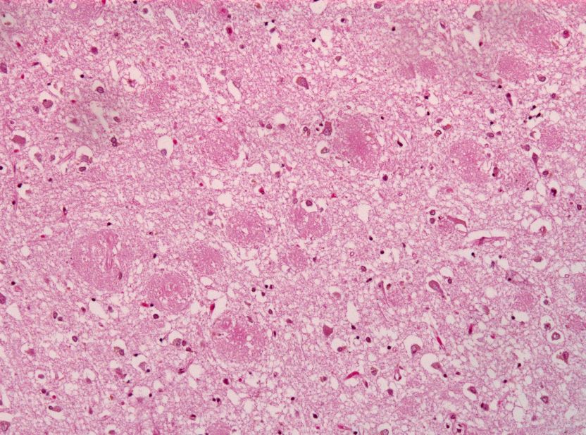 Figure 4. Abb. 4 Schnitt durch das Hirngewebe eines Alzheimer-Patienten. Mit Hilfe der Hämatoxylin-Eosin-Färbung sind die Plaques als rundliche stärker rötliche Flecken sichtbar gemacht worden. (Jensflorian, CC BY-SA 3.0)