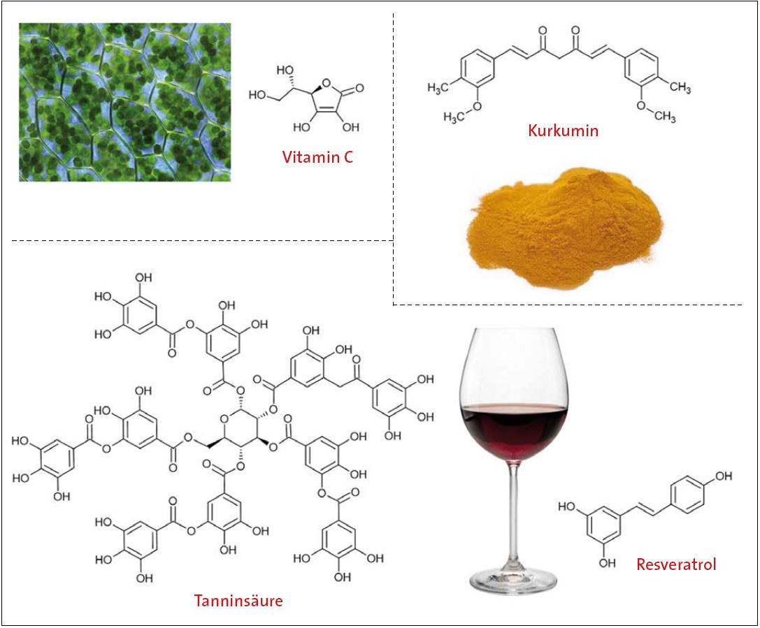 Figure 5. Abb. 5 Strichformeln einiger natürlich vorkommender Antioxidantien. Vitamin C wird in vielen Pflanzen in den Chloroplasten angereichert. Kurkumin, der Inhaltsstoff der Kurkumapflanze, findet als Gewürz und als Therapeutikum gegen Alzheimer Verwendung. Im Wein sind zahlreiche Antioxidantien enthalten, darunter die besonders wirksamen Stoffe Tanninsäure und Resveratrol. (Kristian Peters - Fabelfroh, CC BY-SA 3.0; BroviPL, Public Domain; Adobe Stock)