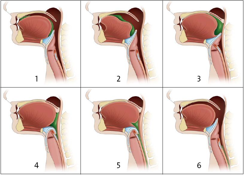 Figure 2. Abb. 2 Sechs Phasen des Schluckvorgangs: 1 Kauen und Einspeicheln der Nahrung; 2 Bolus (hier der Nahrungsbrei) wandert nach hinten, Schluckreflex wird ausgelöst; 3 Gaumensegel schließt, Kehlkopf wird nach oben vorne unter die Zunge geschoben, Kehldeckel schließt, Atmung wird eingestellt, Zunge schiebt Bolus aus dem Mundraum; 4 Bolus rutscht über den Kehldeckel hinweg, Speiseröhreneingang öffnet sich; 5 Bolus wird in die Speiseröhre befördert und durch eine peristaltische Welle (rhythmische Muskelkontraktionen) zum Magen geleitet; 6 Kehlkopf senkt sich wieder ab und der Kehldeckel öffnet sich wieder, die Atmung setzt wieder ein. (Aldona, Adobe Stock)