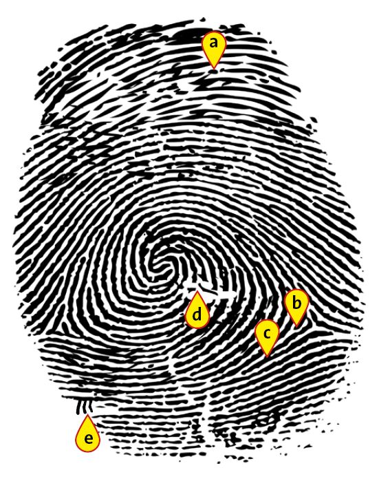 Figure 1. Abb. 1 Fingerabdruck. Kleine zufällige spezielle Leistendetails, sogenannte Minutiae, bestimmen die Individualität. a = Insel (eine zweimalige Leistenunterbrechung mit einem kurzen, nur eine Pore tragenden Leistenstück), b = abruptes Ende, c = Gabelung (mit oder ohne Einschluss), d = rudimentäre Leisten (Zwischenlinien) und e = Kammbildung (drei oder mehr parallele Leisten treten im nahezu rechten Winkel an eine andere Leiste heran). (nach Pixabay)