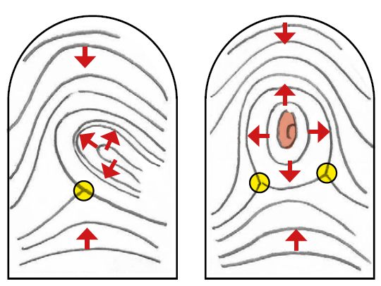 Die Muster der Fingerabdrücke werden durch Leisten und Rillen gebildet (Abb. 2). Die Gesamtheit der Leisten formt sich zu komplexen Gebilden, die man zu drei Grundtypen zusammenfassen kann: Wirbel (W), Schleifen (S) und Bogen (B) – wobei man die Schleifen noch in rechtswendige (Ulnarschleife: U) und linkswendige (Radialschleife: R) Schleifen unterteilt.