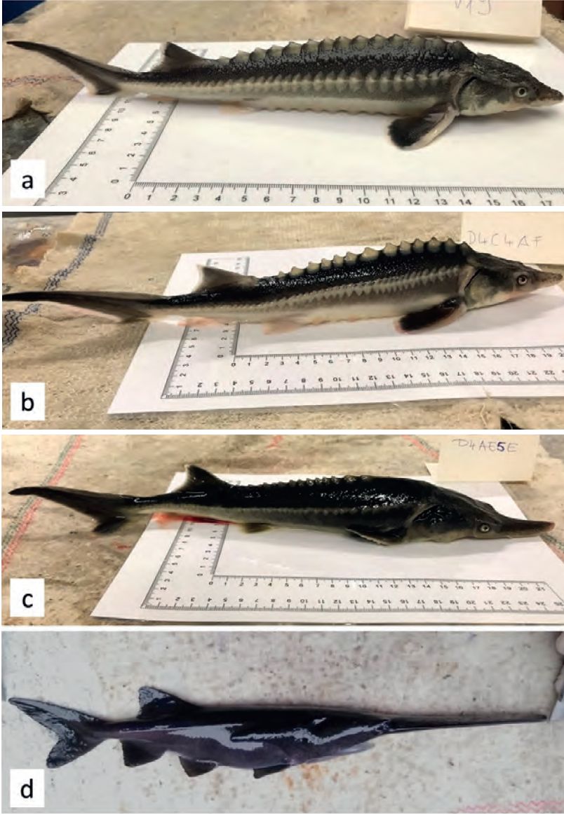 Figure 1. Abb. 1 Einjährige Störe im Vergleich: (a) Russischer Stör, (b) Hybride mit großem Genom (pentaploid), (c) Hybride mit kleinem Genom (triploid) sowie (d) Löffelstör (Kaldy et al. 2020, Fig. 4 ©, Licensee MDPI, Basel, Switzerland, http://creativecommons.org/licenses/by/4.0/)