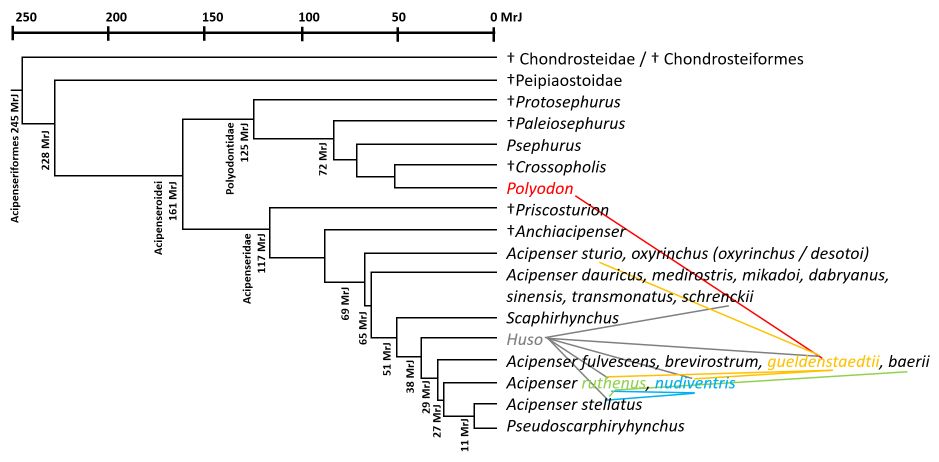 Figure 2. Abb. 2 Ein Cladogramm der Ordnung der Störartigen von Shedko (2022, Fig. 2; vereinfacht) samt Hybriden. Aufgrund fossiler Kalibrierungspunkte sind die radiometrischen Altersangaben der Divergenzzeiten aber wahrscheinlich etwas zu niedrig angesetzt. Jeweils mindestens eine Elternart der Hybriden ist zwecks Übersichtlichkeit farbig markiert. (Eigene Darstellung)