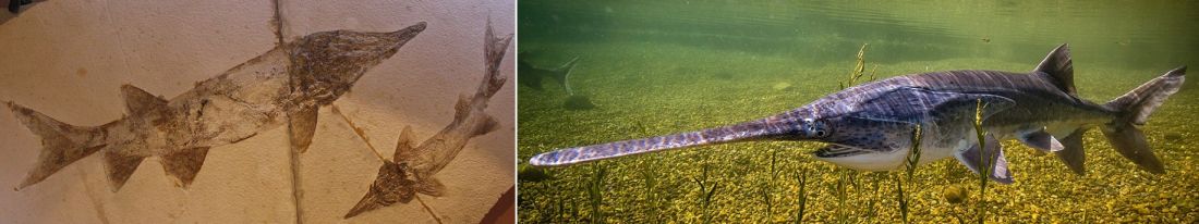 Figure 4. Abb. 4 Protopsephurusliui (links) ist ca. 125 MrJ alt und stammt aus derselben Familie wie der heutige Löffelstör (Polyodon spathula; rechts). (Jonathan Chen, CC BY-SA 4.0; CC0)