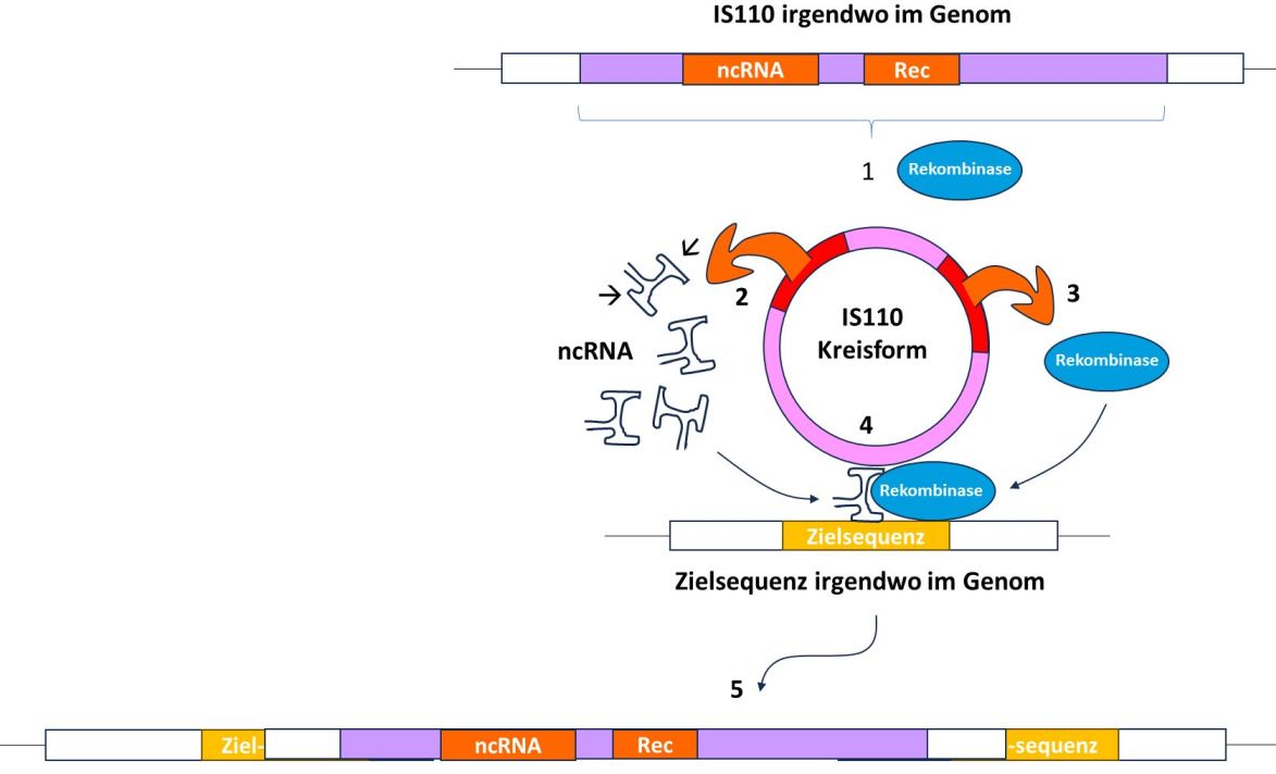 Figure 1. Abb. 1 1 Durch Rekombinase (Rec) wird das IS110 Element ausgeschnitten und ist danach kreisförmig vorhanden. 2 Das ncRNA-Molekül, das zwei Schleifen bildet (), wird nun vermehrt abgeschrieben. 3 Das Rekombinase-Enzym wird abgeschrieben. 4 Die Schleifen der ncRNA binden den Donor (IS110) und das Ziel (im Genom). 5 Das Rekombinase-Enzym schneidet und rekombiniert die beiden DNA-Segmente. (© Peter Borger)