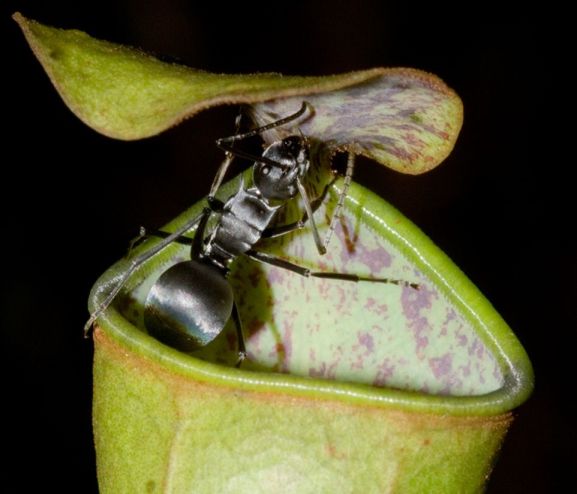 Figure 1. Abb. 2 Kanne von Nepenthesgracilis mit Besuch der Ameise Polyrhachis pruinosa. Man erkennt die Wachskristallflächen an der inneren Kannenwand und an der Unterseite des Kannendeckels. (© 2012 Bauer et al. in PLoS ONE, https://doi.org/10.1371/journal.pone.0038951, CC BY 2.5)