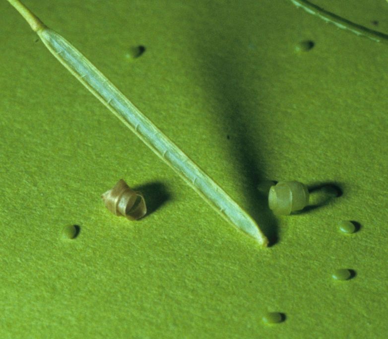 Figure 1. Abb. 2 Die Scheidewand der länglichen Schoten von Cardamine hirsuta und die beiden davon abgelösten und aufgerollten Fruchtklappen mit herausgeschleuderten Samen. (Foto: R. Junker)